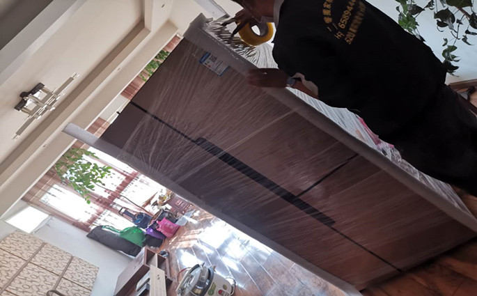 將事先準備好的小車放置于冰箱一側,兩人一前一后合力將冰箱搬運的四輪平板小車上。若一人托運,需用移動帶將冰箱固定于小車上,兩人搬運則一人在前面拉,一人在后面扶穩,以確保搬運途中冰箱不至于傾倒損壞。
